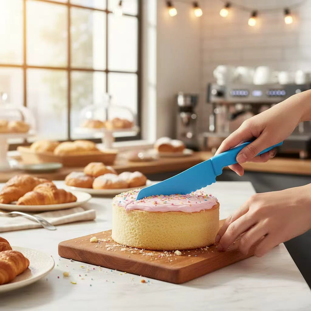 The Bakeware Buddy will be your non-stick pan's best friend! Made of durable food grade plastic, this knife features a 4-inch serrated blade that's specially designed to cut cakes, brownies, pies, casseroles, bar cookies, and any other baked goods on non-stick pans and bakeware without scratching and damaging their surface. Safe for kids and adults, the knife can also be used for icing and decorating cakes and cupcakes, or to cut lettuce and tomatoes. Simply pop the knife in the dishwasher for easy clean-up! Enjoy the convenience of your non-stick pans to their full extent, and put the fear of scratching them behind you by using the Bakeware Buddy.