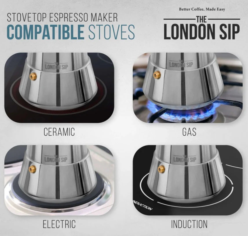 Versatile Compatibility: Unlike many stovetop espresso makers, the London Sip is compatible with all stove types—gas, electric, ceramic, and induction. This universal compatibility ensures you can enjoy your espresso no matter where you are or what type of stove you have.