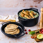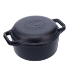 - Multi-use Dutch Oven Combo Cooker, 5.7L / 6qt, seasoned cast iron.