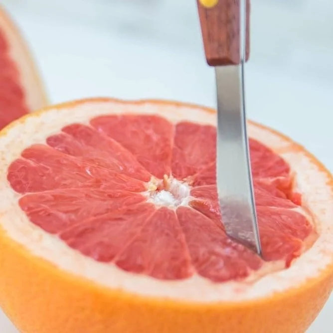 Calling all grapefruit lovers! Enjoying the juicy, nutrient-packed fruit can be a hassle when trying to cut free sections with a regular knife. Scoop and cut into the round fruit easily with this specially made Grapefruit Knife! This tool features two stainless steel blades: a curved, finely serrated blade quickly frees sections from rind, and the double riveted blade cuts and separates sections from membrane. Minimize the mess and the struggle, so you can spend more time enjoying.