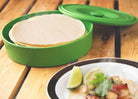 Keep your tortillas warm while you prepare your filling for fajitas, soft tacos or carne asada. Made of durable, food-safe plastic in a beautiful green color, this warmer is easy to use: simply pop in the microwave before your meal without the lid. Fill with your choice of tortillas, or even pancakes, waffles, or crepes, and seal in the heat with the lid. Keep your tortillas warm and moist at the dinner table throughout your meal! Don't settle for cold, tough, or hard tortillas when serving your next Mexican dish. Ensure warmness, softness, and flexibility with this attractive tortilla warmer.