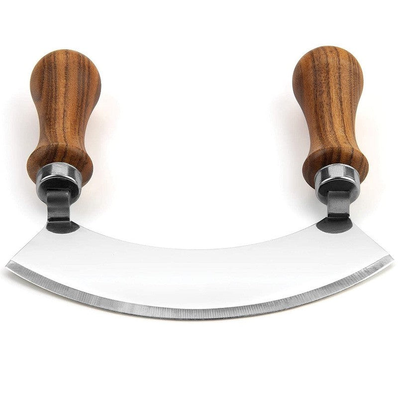 With a stainless steel blade and acacia wood handles, this knife has a comfortable, ergonomic design that allows it's rocking motion for cutting a pleasure to make. It's purpose is to safely and efficiently mince, dice, chop and slice all types of food like fresh herbs, leafy vegetables and even dense meat.