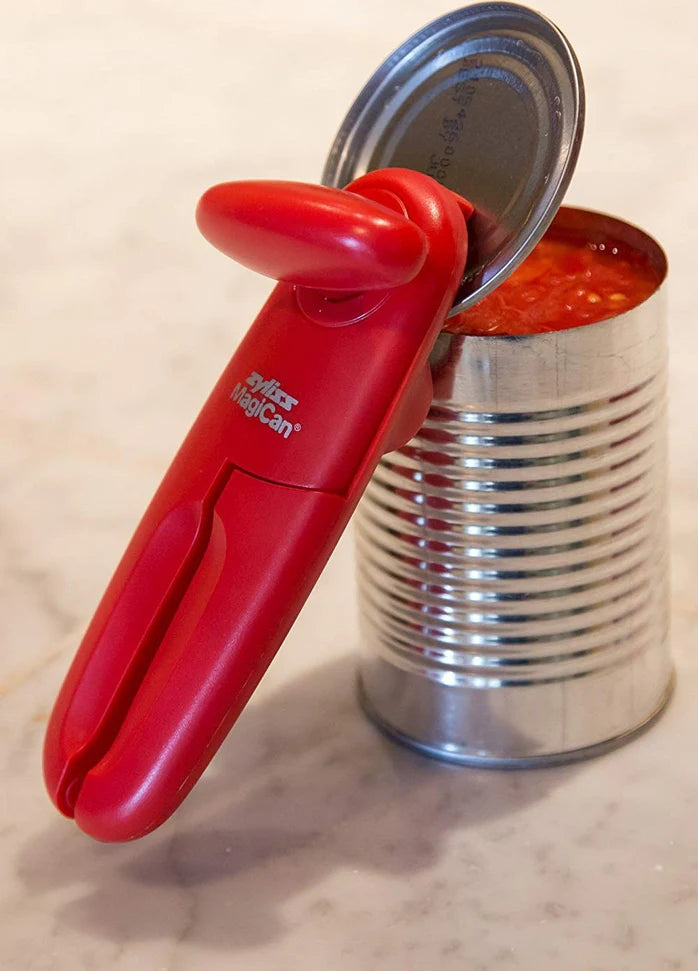 Long a number one selling tin opener in Europe, the Zyliss MagiCan manual can opener safely and efficiently opens cans of all sizes. Designed to cut around the side of the can, the MagiCan cleanly slices the lid from the can while eliminating sharp edges.