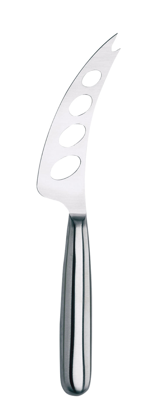 Features holes through the blade that prevents cheese from sticking as well as a small fork on tip which allows chunks to be broken off and served without changing tools