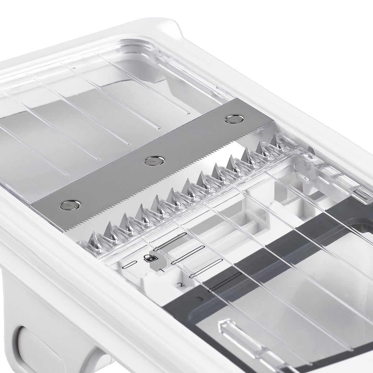 High-grade serrated stainless steel blade creates perfectly uniform slices and julienne strips quickly and easily
