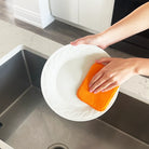 Dishwasher safe, easy to clean, and non-abrasive scrubber made from cotton.