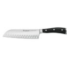 The Santoku is an innovative style of chef's knife specific to Japan. With its nimble blade and superb balance, the WÜSTHOF Classic Ikon 7" Hollow Edge Santoku Knife is the perfect tool for almost any kitchen task, from chopping fresh herbs to boning fish to slicing meat. What's more, the hollow edge allows small air pockets to form during slicing, which prevents food from sticking to the blade. This special Classic Ikon Santoku is indispensable in kitchens around the world. WÜSTHOF's Classic Ikon series merges the sleek, sophisticated elegance of a high-performance knife with the precision and durability of an all-purpose kitchen companion. Classic Ikon knives feature a distinct double-bolster design for professional-style heft, balance, and beauty. Handles are crafted from a highly durable synthetic material "Polyoxymethylene (POM)," which has a tighter molecular structure to resist fading and discolouration. The elegant shape of the handle is designed for a comfortable grip, and each and every Classic Ikon blade is precision honed from a single piece of WÜSTHOF steel.