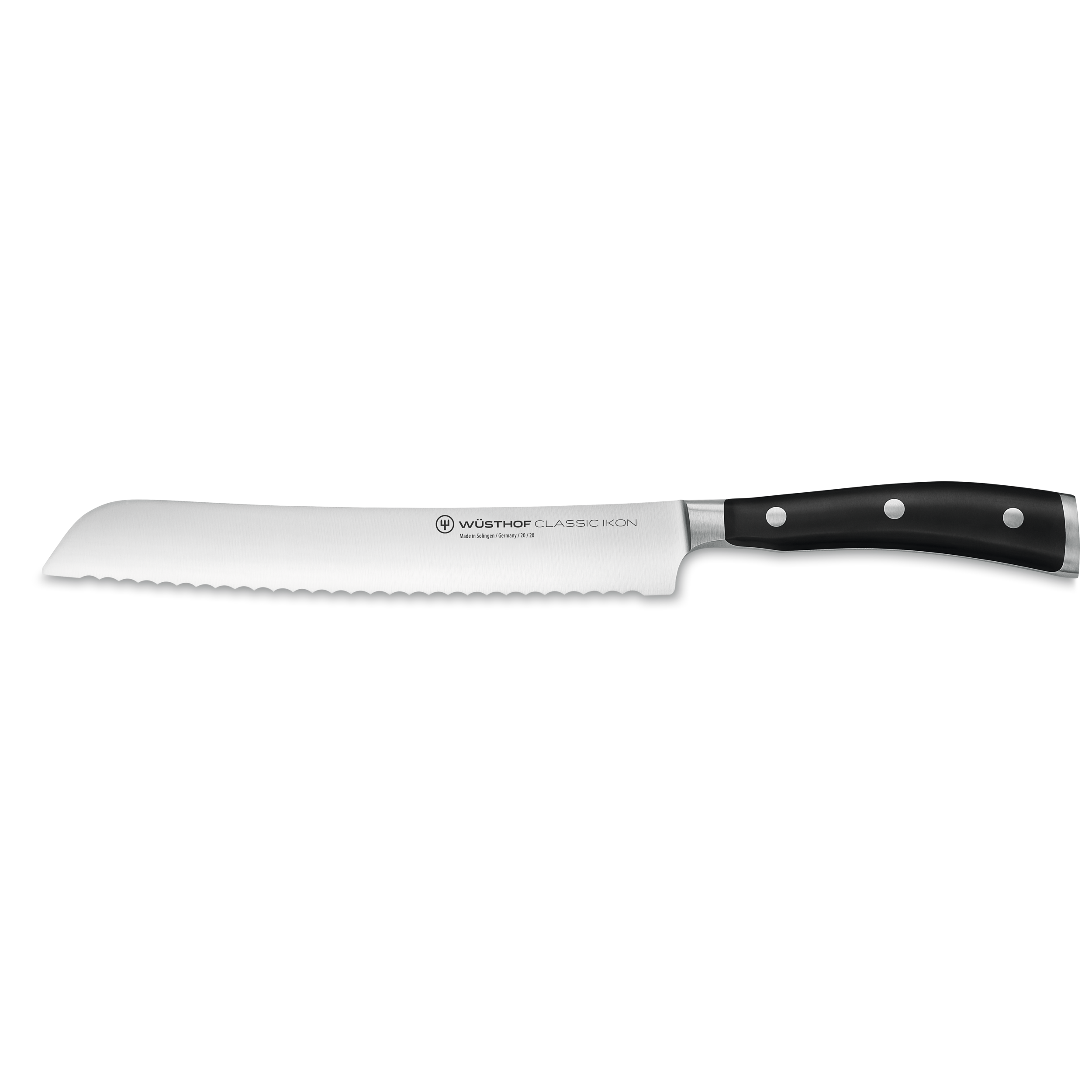 The WÜSTHOF Classic Ikon 8" Bread Knife is, fittingly, an icon among knives, and one of the more important knives to have in your kitchen. Beyond crusty loaves of bread and soft dinner rolls, this Classic Ikon bread knife is also perfect for slicing into hard-skinned fruits and vegetables. The serrated edge of the Classic Ikon bread knife works like the teeth of a saw, yet much finer — this means minimal pressure is required for clean, even cuts.