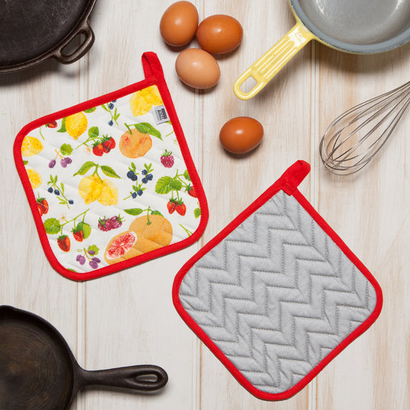 Brighten up the kitchen with this Fruit Salad Chef Potholder by Now Designs. The colorful fruit pattern and red border complement fresh finds in your recipes.