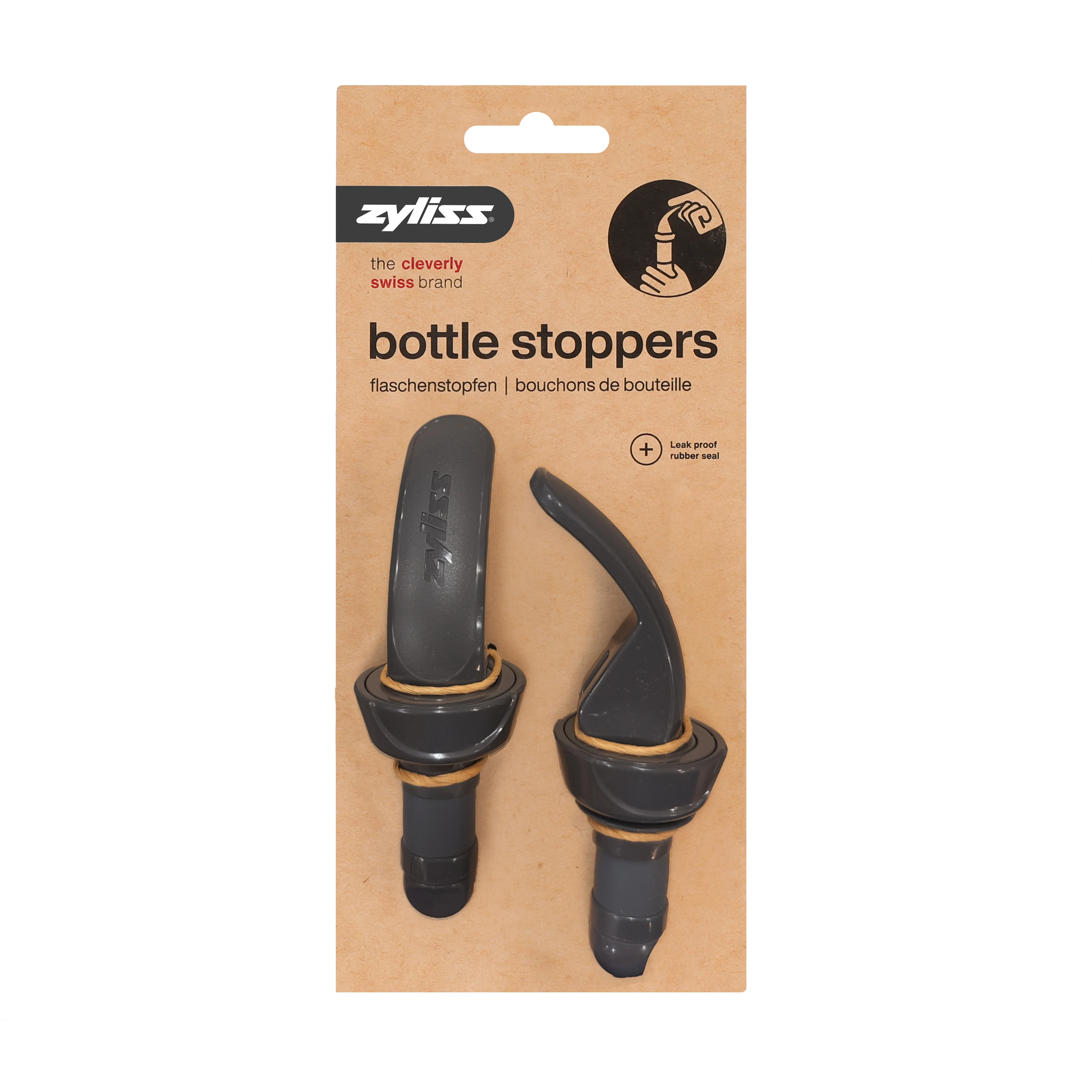 The Zyliss Bottle Stoppers 2 pc keep drinks fresh and bottles securely sealed. Featuring a durable, leak-proof rubber seal and a long, easy-grip handle, they make opening and closing bottles simple and mess-free. Designed to fit a wide range of bottle types, from sparkling water and soda to wine and juice. They provide a tight seal that helps preserve flavor and carbonation. Each pack includes two reusable, dishwasher safe bottle stoppers - ideal for everyday use and compact storage.