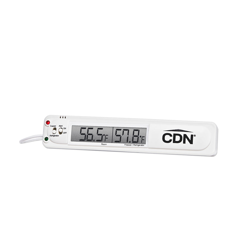 Attaches to outside of refrigerator or freezer, for food safety and energy efficiency.