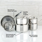 Confederation is Meyer’s newest line of high quality cookware proudly manufactured in Canada. Made from18/10 stainless steel, and featuring an encapsulated bottom for efficient heat conduction that is safe for all cook tops of modern kitchens, including induction. Durable, secure riveted handles, no-drip lips, precision fitting lids, oven and dishwasher safe, the Confederation line is built to last and we stand behind it with our exceptional Lifetime Warranty. Oven safe to 500˚F. Set includes 1.5L, 2L & 3L saucepans, 5L Dutch oven, 1.5L Steamer, 24cm/9.5" Stainless steel fry pan and 4 stainless steel lids.